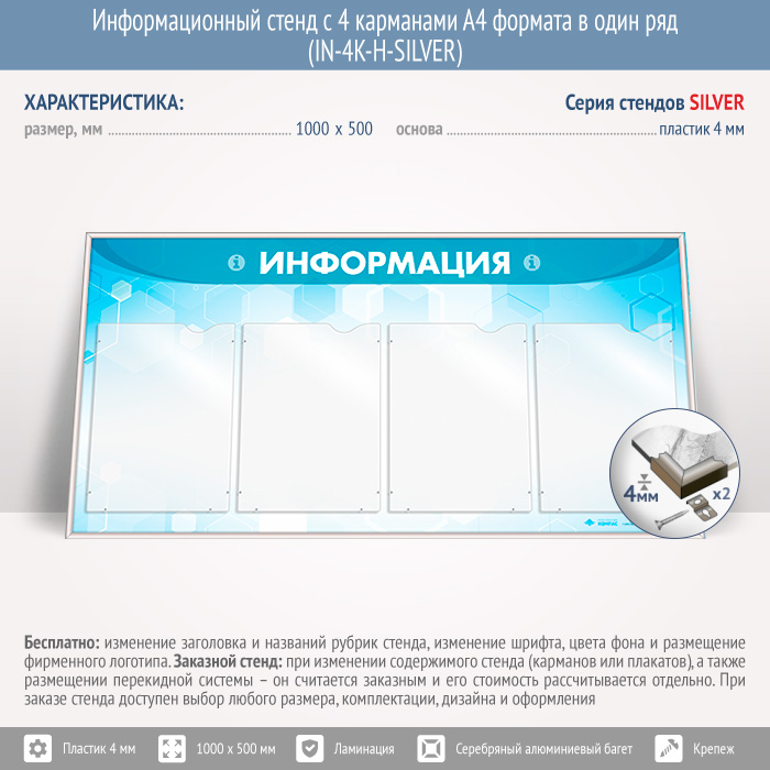 Информационный стенд с 4 карманами А4 формата в один ряд (IN-4K-H-SILVER) в Ижевске купить