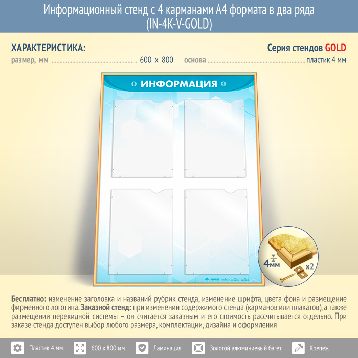 Информационный стенд с 4 карманами А4 формата в два ряда (IN-4K-V-GOLD) в Ижевске купить