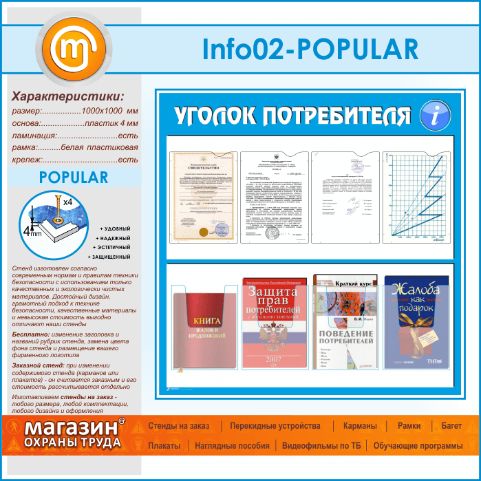 Стенд «Уголок потребителя» с 4 плоскими и 4 объемными карманами А4 формата (IN-02-POPULAR) в Ижевске купить