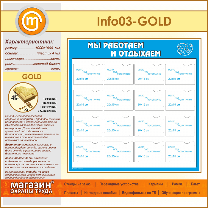 Стенд «Мы работаем и отдыхаем» с 16 карманами А5 формата (IN-03-GOLD) в Ижевске купить