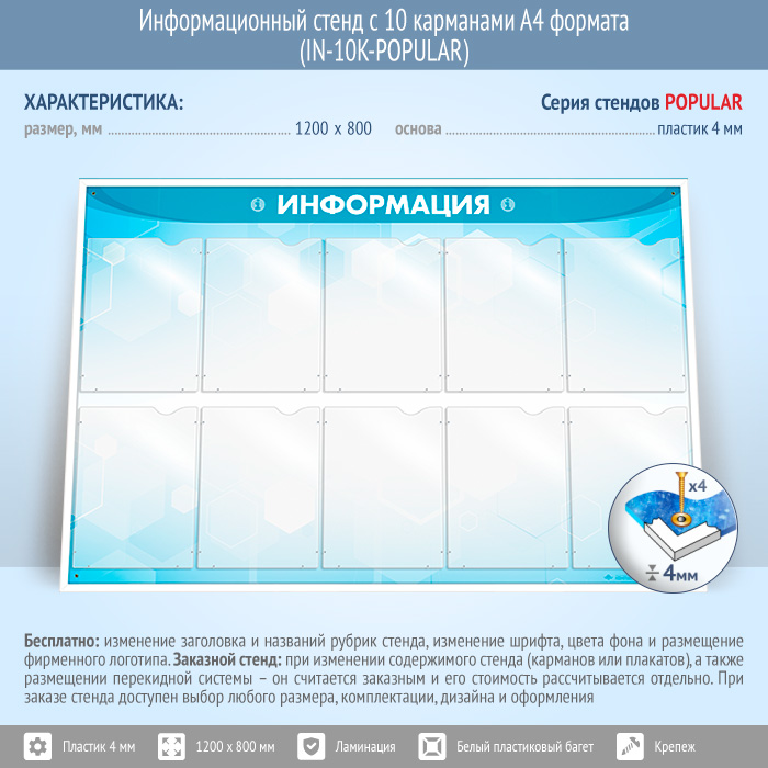 Информационный стенд с 10 карманами А4 формата предназначен для самостоятельного размещения информации – от документов, приказов и инструкций до рекламы... Часто на таких стендах размещают контактные данные, образцы заполняемых бланков, график работы, порядок приема документов в организации и прочее