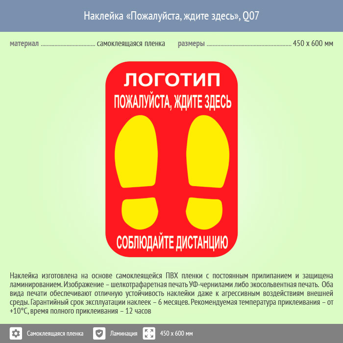 Наклейка на пол «Пожалуйста, ждите здесь», Q07 (пленка c ламинированием, 450х600 мм) в Ижевске купить