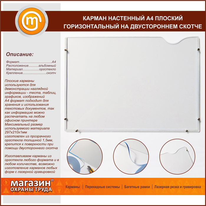 Карман настенный А4 плоский горизонтальный на двустороннем скотче в Ижевске купить
