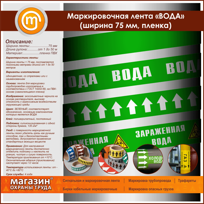 Маркировочная лента «ВОДА» (ширина 75 мм, самоклеящаяся плёнка) в Ижевске купить