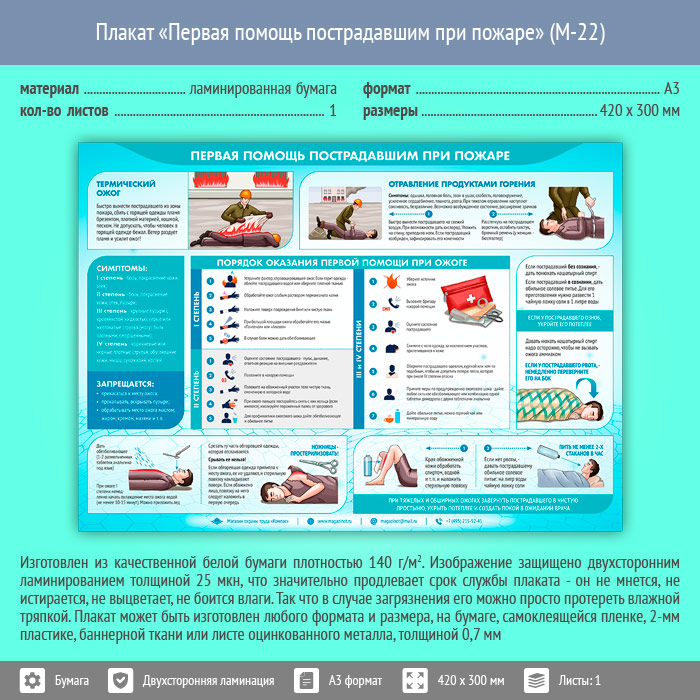 Плакат «Первая помощь пострадавшим при пожаре» (М-22, ламинированная бумага, А3, 1 лист) в Ижевске купить