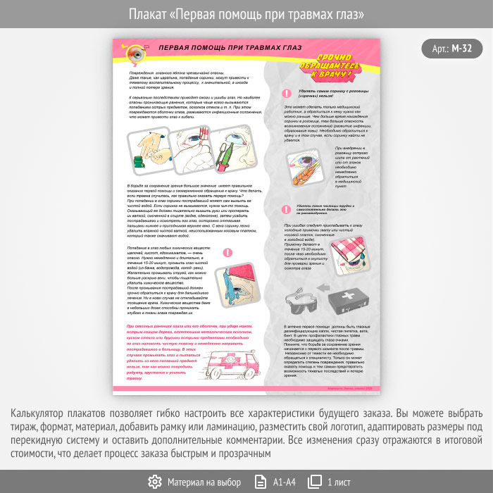 Плакат «Первая помощь при травмах глаз» (М-32, 1 лист) в Ижевске купить