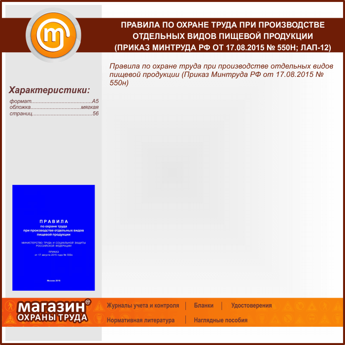 Правила по охране труда при производстве отдельных видов пищевой продукции (Приказ Минтруда РФ от 17.08.2015 № 550н) (ЛАП-12) в Ижевске купить