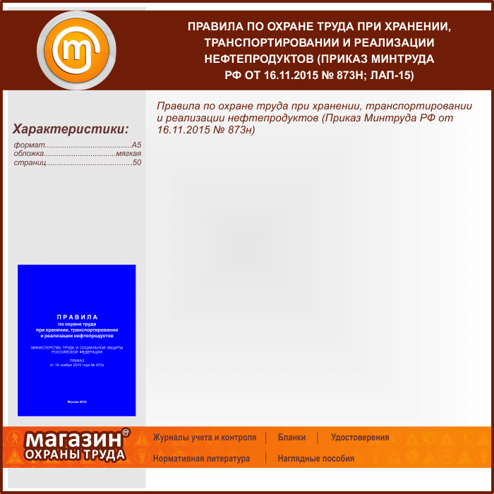 Правила по охране труда при хранении, транспортировании и реализации нефтепродуктов (Приказ Минтруда РФ от 16.11.2015 № 873н) (ЛАП-15) в Ижевске купить