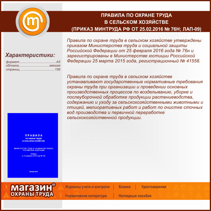 Правила по охране труда в сельском хозяйстве (Приказ Минтруда РФ от 25.02.2016 № 76н) (ЛАП-09) в Ижевске купить