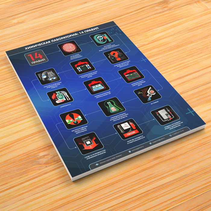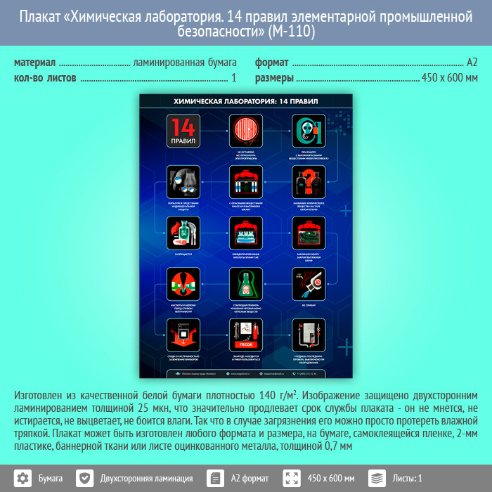 Плакат «Химическая лаборатория. 14 правил элементарной промышленной безопасности» (М-110, ламинированная бумага, А2, 1 лист) в Ижевске купить