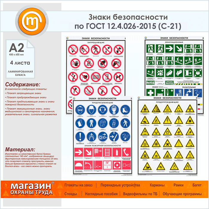 Плакаты «Знаки безопасности по ГОСТ 12.4.026-2015» (С-21, ламинированная бумага, А2, 4 листа) в Ижевске купить