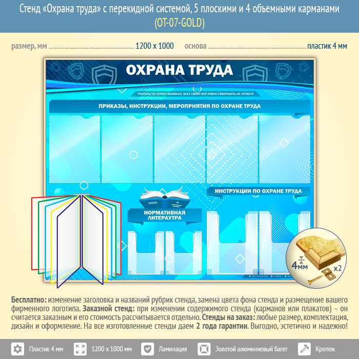 Стенд «Охрана труда» с перекидной системой, 5 плоскими и 4 объемными карманами (OT-07-GOLD) в Ижевске купить