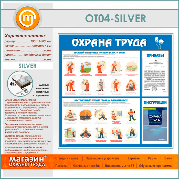 Стенд «Охрана труда» с плоским и объемным карманами (OT-04-SILVER) в Ижевске купить