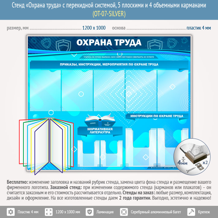 Стенд «Охрана труда» с перекидной системой, 5 плоскими и 4 объемными карманами (OT-07-SILVER) в Ижевске купить