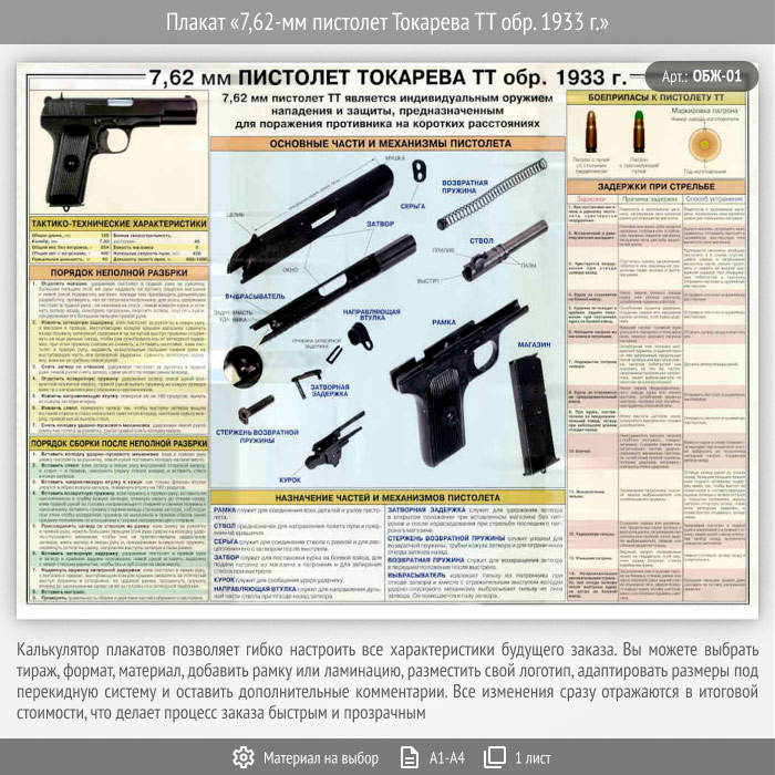 Плакат «7,62-мм пистолет Токарева ТТ обр. 1933 г.» (ОБЖ-01, 1 лист) в Ижевске купить