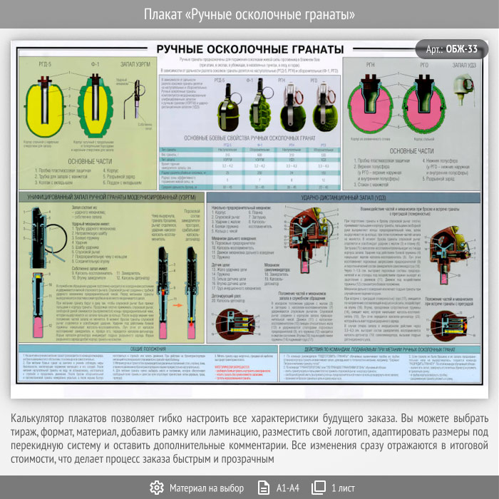 Плакат «Ручные осколочные гранаты» (ОБЖ-33, 1 лист) в Ижевске купить