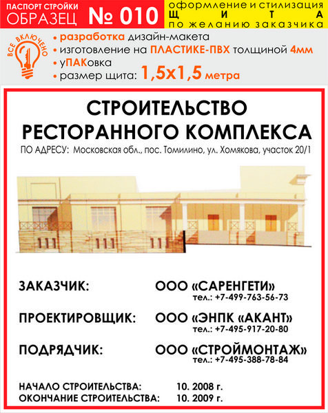 Паспорт стройки, образец № 10 (пластик 4 мм, 1500х1500 cм) в Ижевске купить