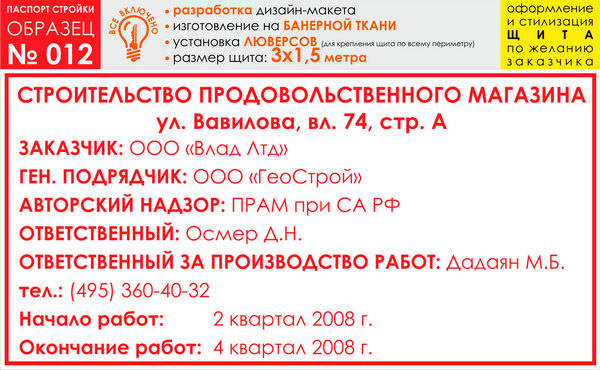 Паспорт стройки, образец № 12 (баннерная ткань, 3000х1500 cм) в Ижевске купить