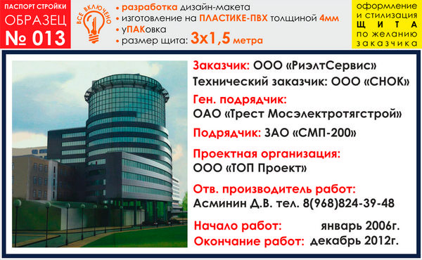 Предлагаем Вам изготовление паспорта стройки на баннерной ткани и ПВХ-пластике. В цену включены: разработка и согласование макета, изготовление и упаковка, а также НДС 18%. На данной странице представлены варианты материалов и размеров для образца № 13. Помимо представленных размеров мы можем изготовить паспорт объекта любого другого размера (цену уточняйте у менеджеров) и на любом материале (включая металл)