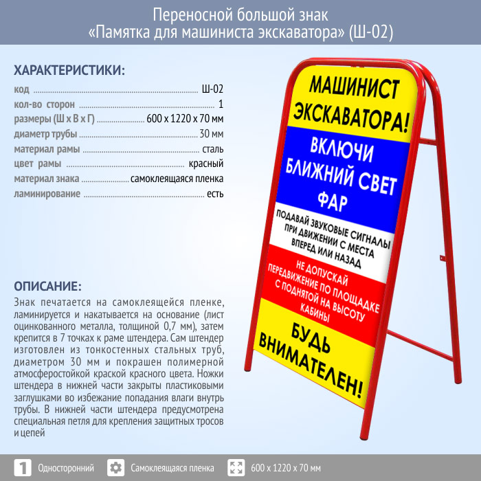 Переносной знак «Памятка для машиниста экскаватора» (Ш-02)