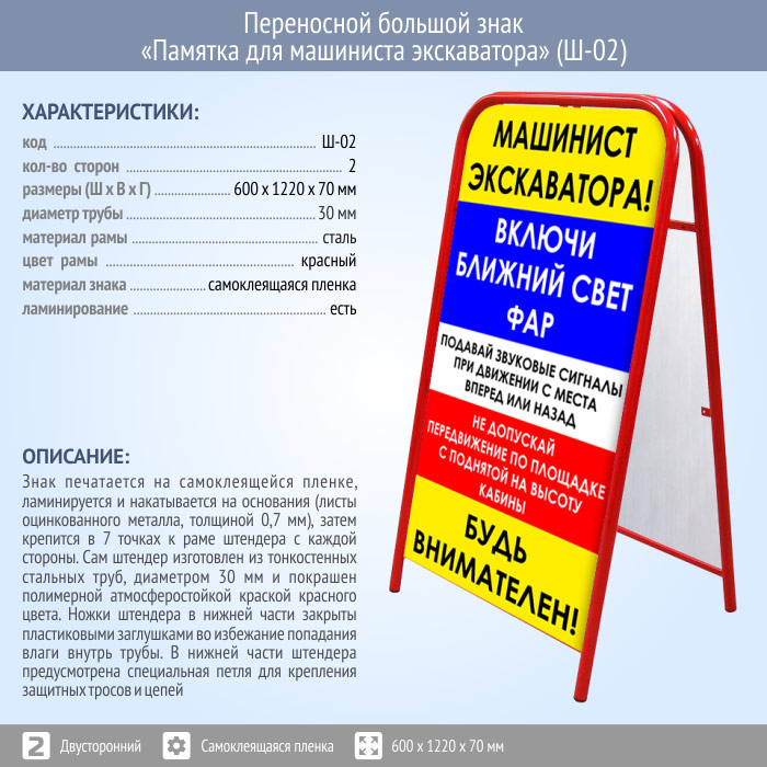 Переносной большой знак «Памятка для машиниста экскаватора» (Ш-02, двусторонний, самоклеящаяся пленка) в Ижевске купить