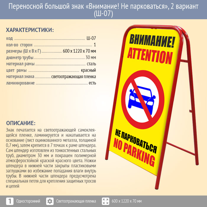 Переносной большой знак «Внимание! Не парковаться», 2 вариант (Ш-07, односторонний, светоотражающая пленка) в Ижевске купить