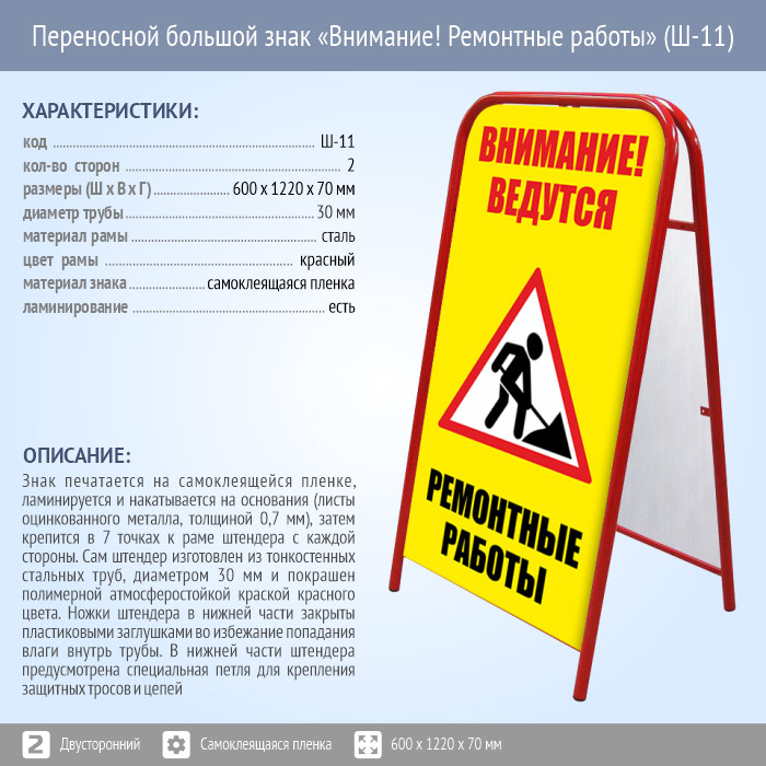Переносной большой знак «Внимание! Ремонтные работы» (Ш-11, двусторонний, самоклеящаяся пленка) в Ижевске купить