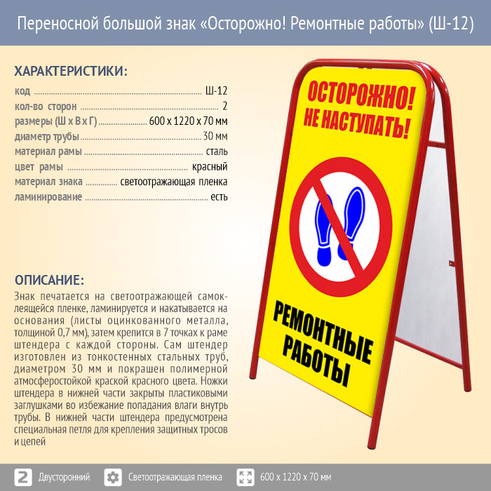 Переносной большой знак «Осторожно! Ремонтные работы» (Ш-12, двусторонний, светоотражающая пленка) в Ижевске купить