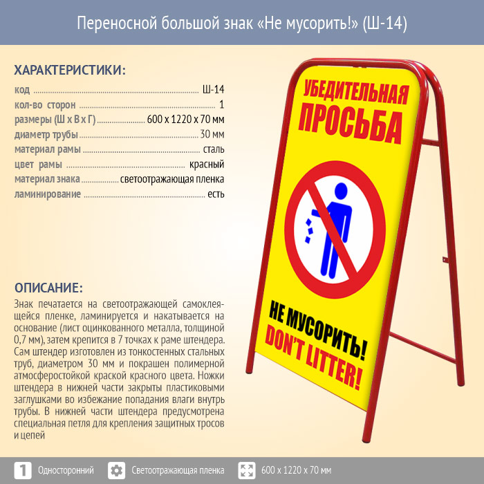 Переносной большой знак «Не мусорить!» (Ш-14, односторонний, светоотражающая пленка) в Ижевске купить