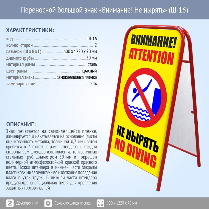 Переносной большой знак «Внимание! Не нырять» (Ш-16, двусторонний, самоклеящаяся пленка) в Ижевске купить