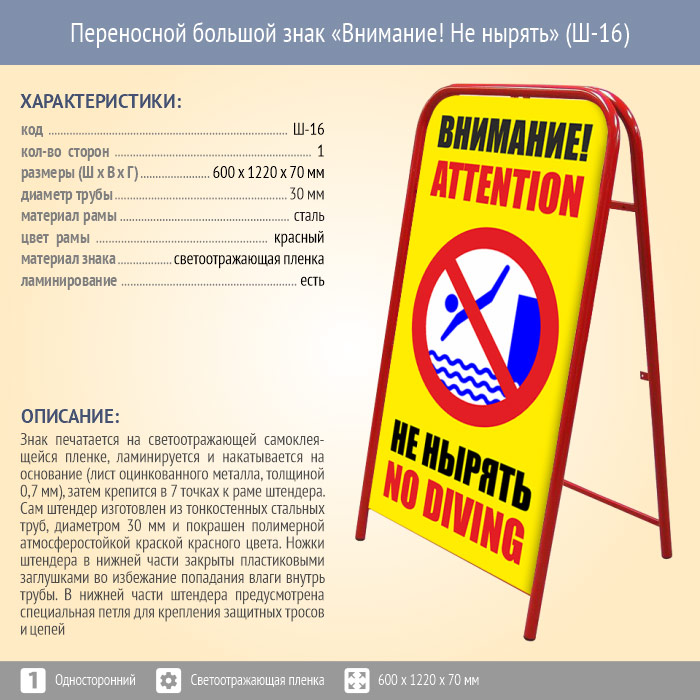 Переносной большой знак «Внимание! Не нырять» (Ш-16, односторонний, светоотражающая пленка) в Ижевске купить