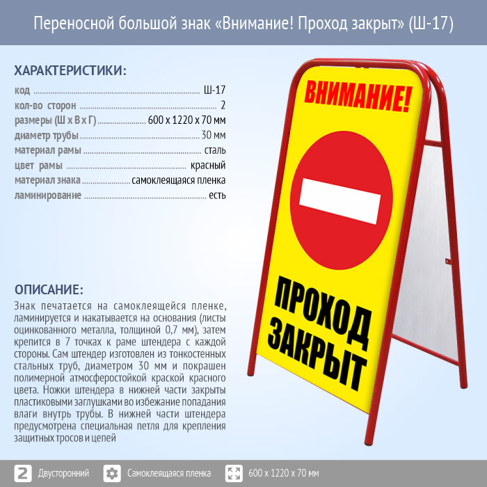 Переносной большой знак «Внимание! Проход закрыт» (Ш-17, двусторонний, самоклеящаяся пленка) в Ижевске купить