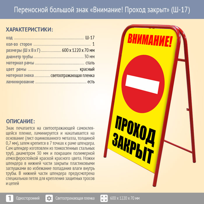 Переносной большой знак «Внимание! Проход закрыт» (Ш-17, односторонний, светоотражающая пленка) в Ижевске купить