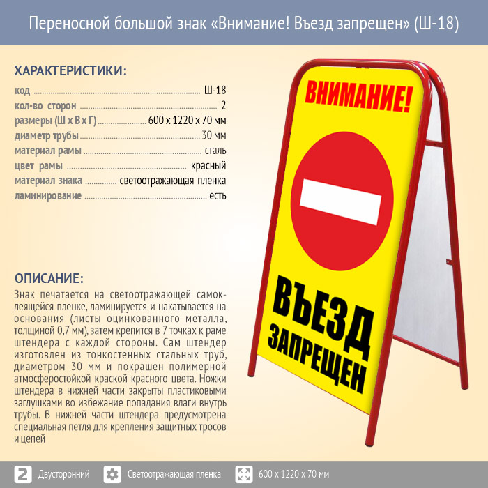 Переносной большой знак «Внимание! Въезд запрещен» (Ш-18, двусторонний, светоотражающая пленка) в Ижевске купить