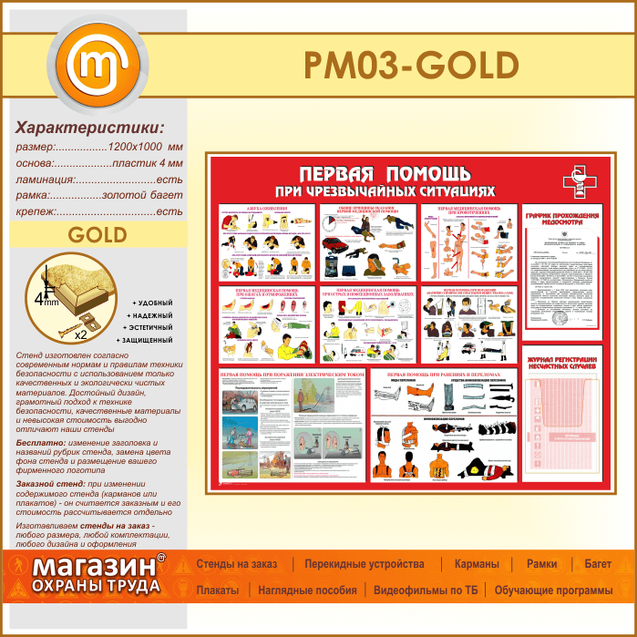 Стенд «Первая помощь при чрезвычайных ситуациях» с плоским и объемным карманами (PM-03-GOLD) в Ижевске купить