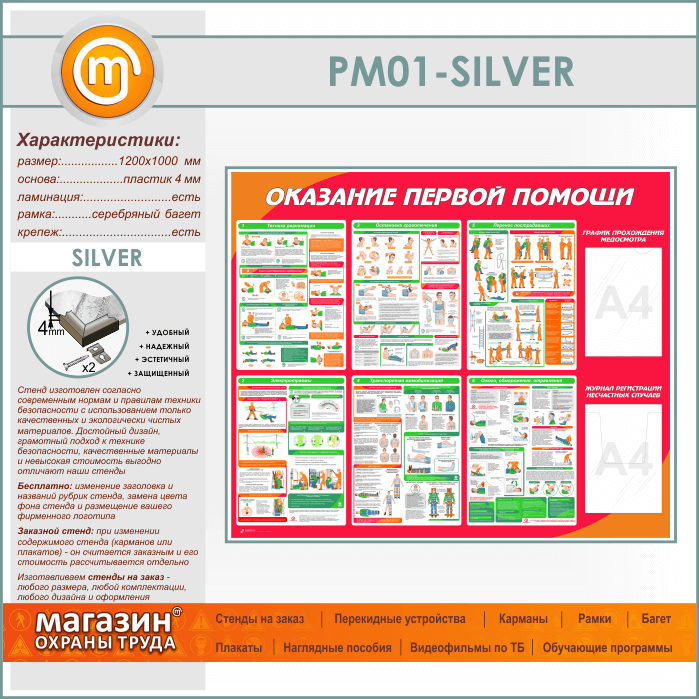 Стенд «Оказание первой помощи» с плоским и объемным карманами (PM-01-SILVER) в Ижевске купить