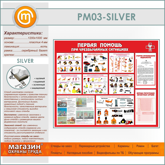 Стенд «Первая помощь при чрезвычайных ситуациях» с плоским и объемным карманами (PM-03-SILVER) в Ижевске купить