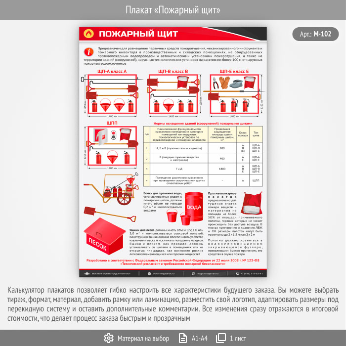 В плакате «Пожарный щит» наглядно изображена необходимая комплектация щитов ЩП-А, ЩП-В, ЩП-Е и ЩПП, описаны нормы оснащения зданий (сооружений) пожарными щитами, рассказано о требованиях к бочкам для хранения воды, ящикам с песком и пожарному полотну. Плакат разработан в соответствии с ФЗ РФ от 22.07.2008 № 123-ФЗ «Технический регламент о требованиях пожарной безопасности»
