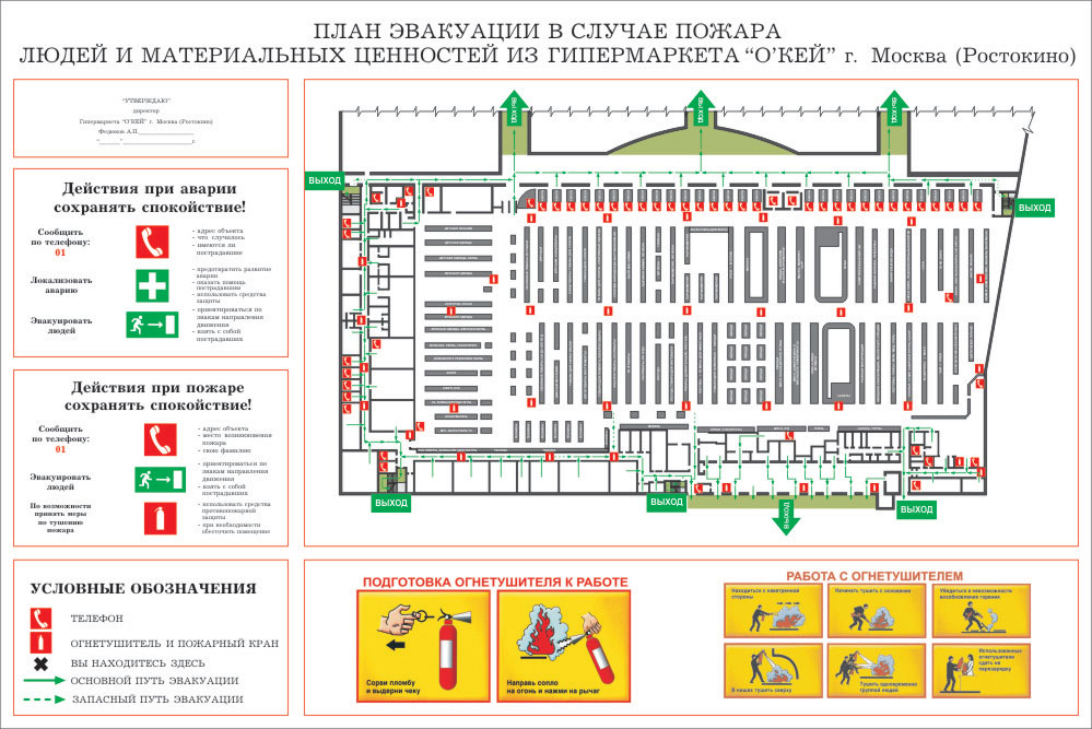 КРАЙНЕ РЕДКИЙ ФОРМАТ Используется для изготовления маршрутов эвакуации из зданий с большим количеством людей, например, торговых и развлекательных центров. Содержит схематичное изображение помещений с размещенными на нем средствами пожаротушения и извещения, путями эвакуации и условные обозначения. Содержит инструкцию при пожаре и инструкцию к подготовке и использованию огнетушителя |