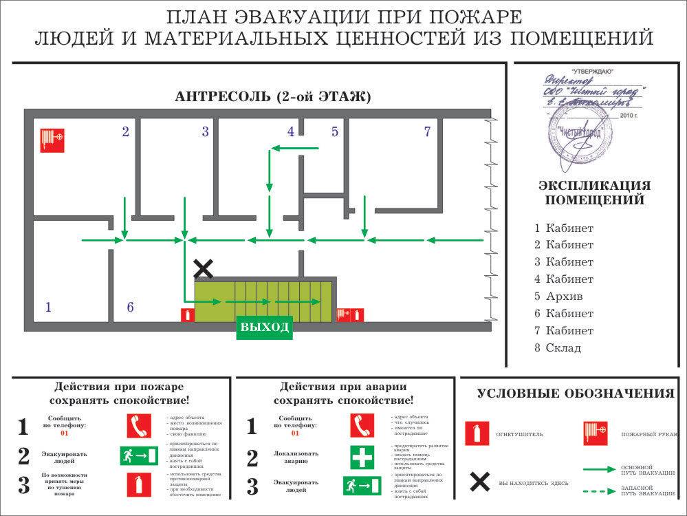 Текстовая часть планов эвакуации должна содержать инструкции о действиях в условиях чрезвычайной ситуации (при пожаре, аварии и т.п.), дополненные для наглядности знаками безопасности и символами