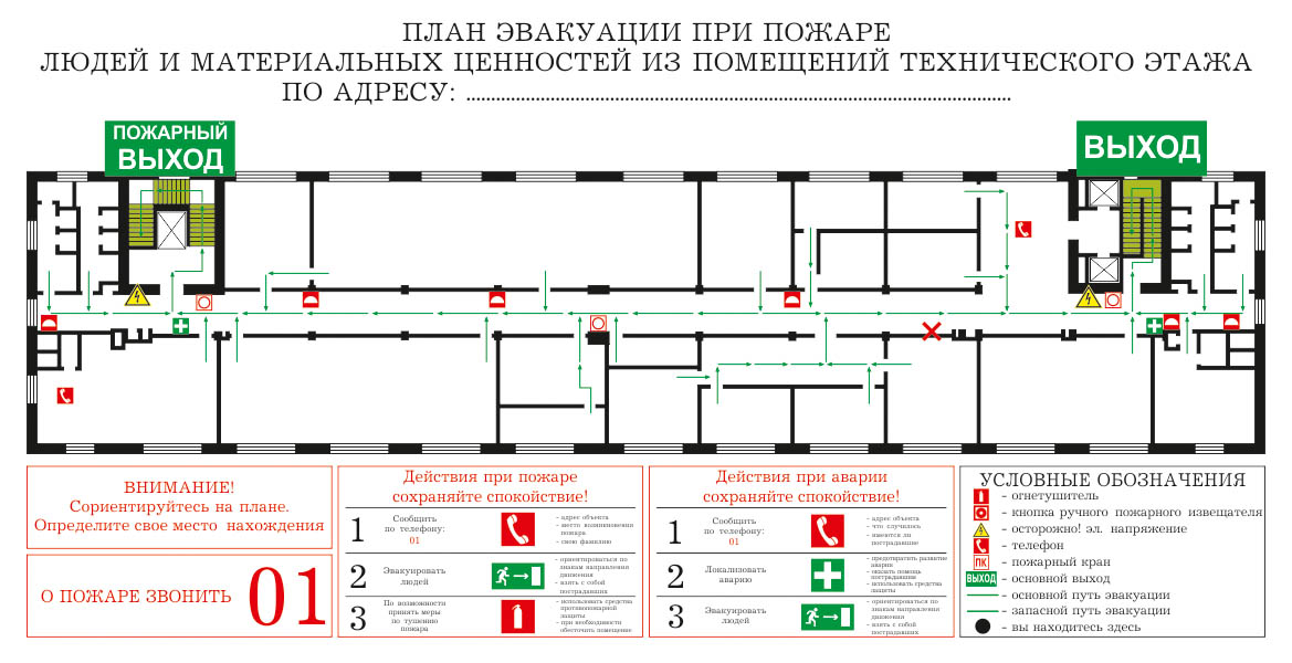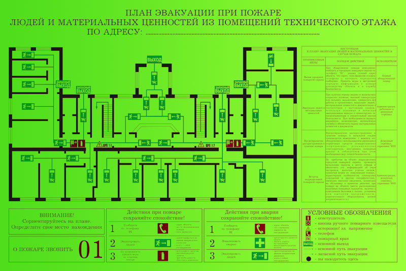 | ✦ | На плане эвакуации расшифровываются все условные обозначения, примененные на них, а также установленные правила поведения людей, порядок и последовательность их действий в условиях чрезвычайной (аварийной) ситуации |