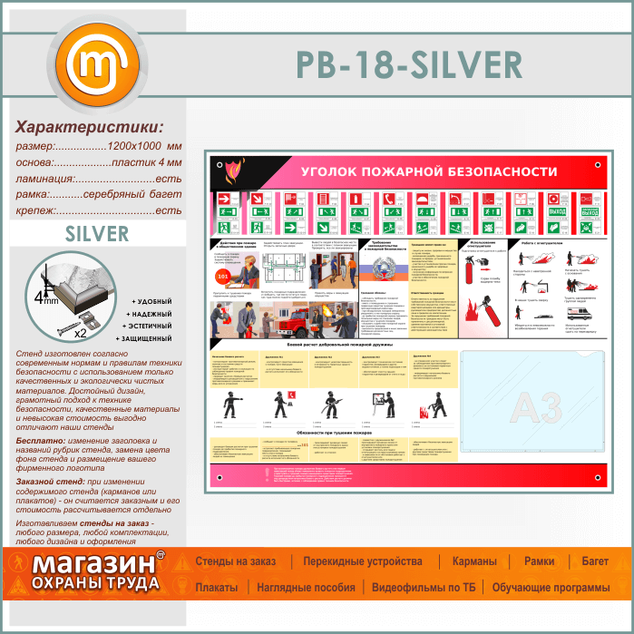 Стенд «Уголок пожарной безопасности» с карманом А3 формата (PB-18-SILVER) в Ижевске купить