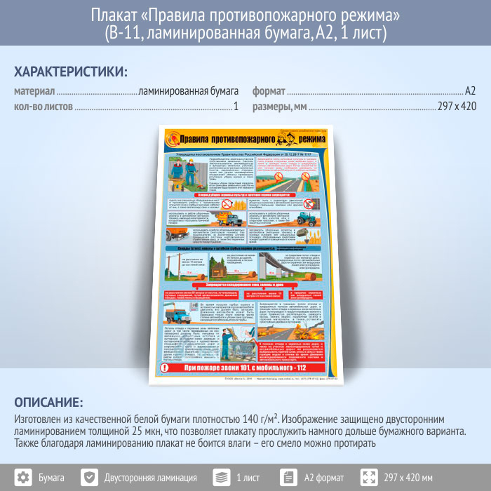 Плакат «Правила противопожарного режима» (В-11, ламинированная бумага, А2, 1 лист) в Ижевске купить