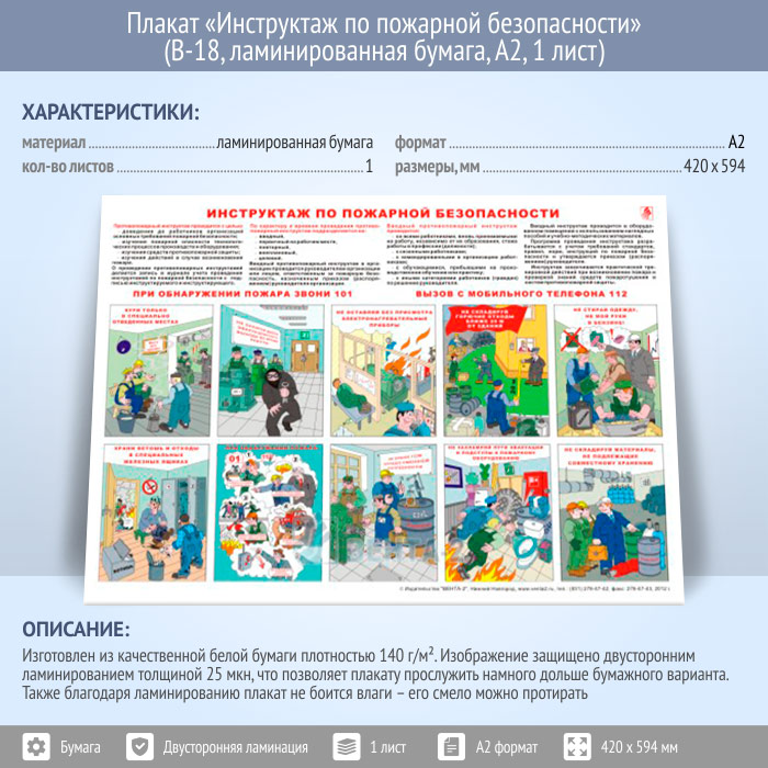 Плакат «Инструктаж по пожарной безопасности» (В-18, ламинированная бумага, А2, 1 лист) в Ижевске купить