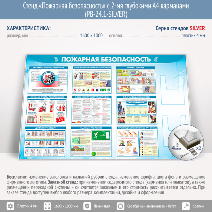 Стенд «Пожарная безопасность» с 2-мя глубокими А4 карманами (PB-24.1-SILVER) в Ижевске купить