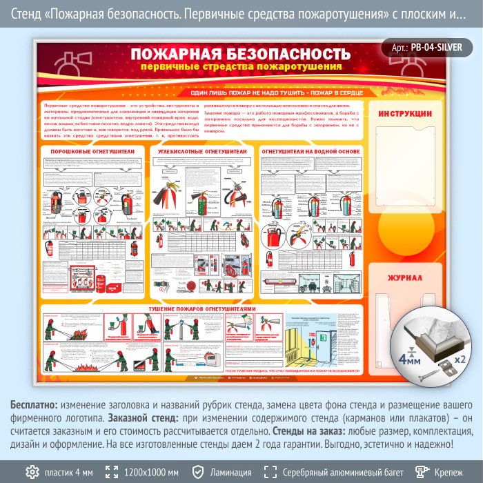 Стенд «Пожарная безопасность. Первичные средства пожаротушения» с плоским и объемным карманами (PB-04-SILVER) в Ижевске купить