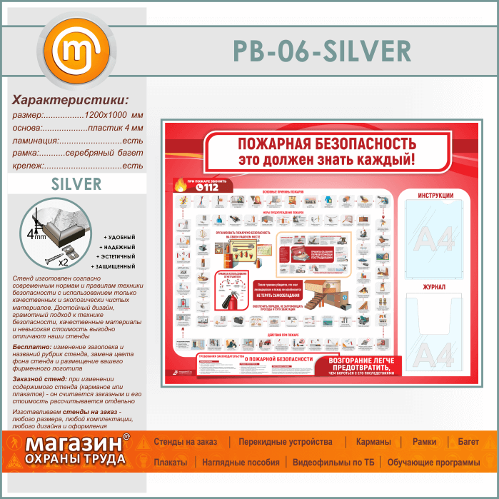 Стенд «Пожарная безопасность. Это должен знать каждый» с плоским и объемным карманами (PB-06-SILVER) в Ижевске купить