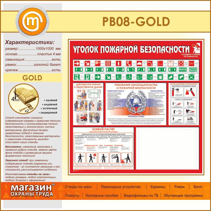 Стенд «Уголок пожарной безопасности» с карманом А3 формата (PB-08-GOLD) в Ижевске купить