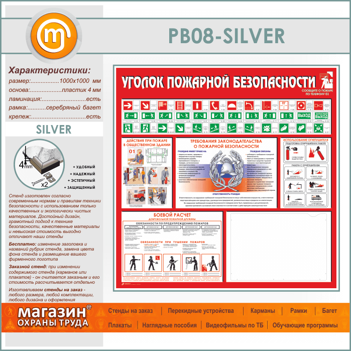 Стенд «Уголок пожарной безопасности» с карманом А3 формата (PB-08-SILVER) в Ижевске купить