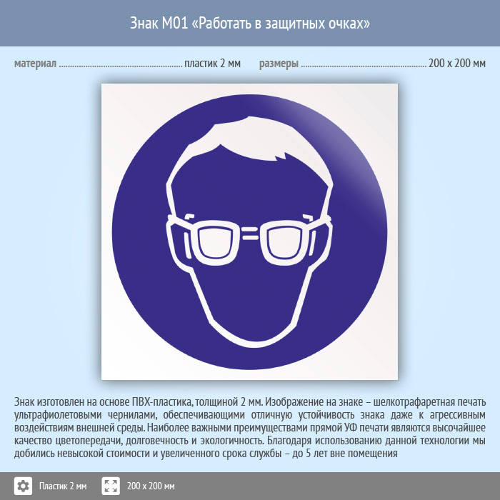 Знак M01 «Работать в защитных очках» (пластик, 200х200 мм) в Ижевске купить